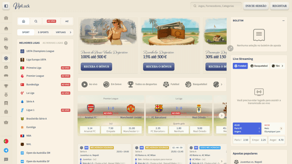 O VipLuck tem odds melhoradas em futebol e boosts especiais em mercados selecionados. Tens apostas múltiplas prontas a usar e podes apostar de forma rápida com um simples clique.
