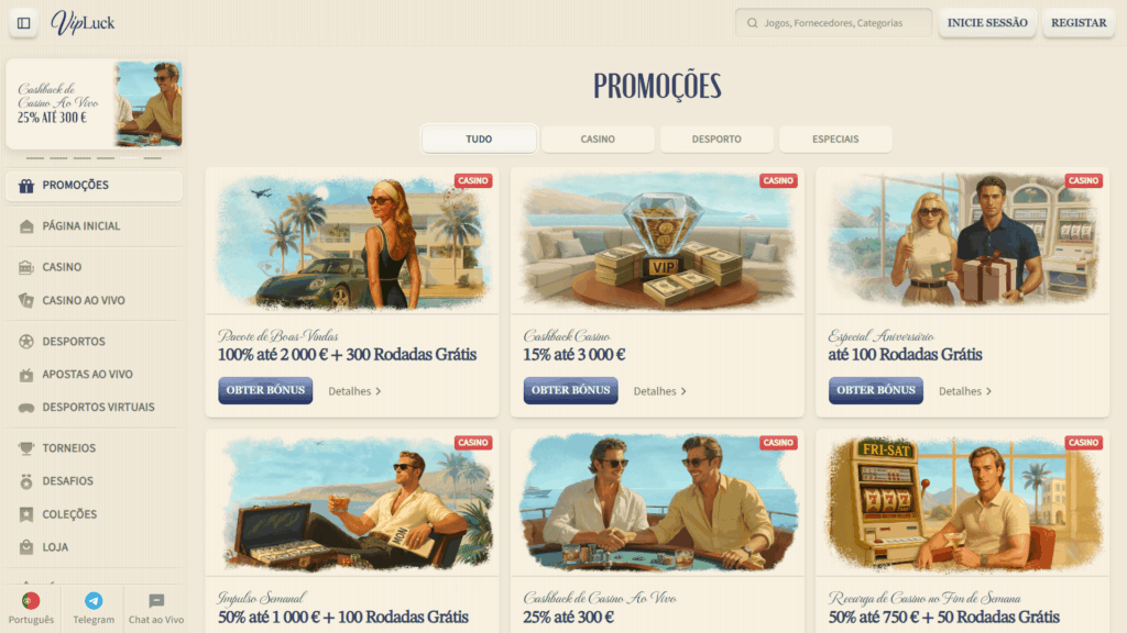 O VipLuck disponibiliza várias ofertas para novos jogadores e também para aqueles que apostam regularmente no site. Desde bónus de boas-vindas atrativos até promoções regulares, bónus sem depósito, rodada grátis e ofertas de cashback, há sempre algo especial à tua espera.