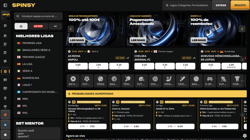As probabilidades aumentadas estão disponíveis no Spinsy onde podes encontrar vários jogos em destaque que oferecem odds melhoradas douradas em mercados desportivos específicos.