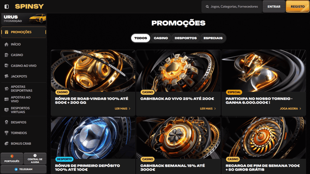 O Spinsy é um site de apostas recente e que despertou a nossa atenção pela variedade de bónus e promoções que oferece. Além disso, a seção de apostas desportivas tem diversos desportos e mercados de apostas para todos os gostos. Com odds competitivas, podes desfrutar de milhares de jogos ao vivo e pré-jogo.